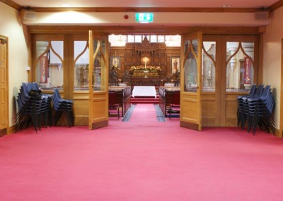 The modern carpeted “Wesley lounge” lounge is now used most days of the week for worship and for social activities for church and community groups. On one wall is the porcelain bust of John Wesley (10) that came from the Wesley Southbank Rd building. The second stained-glass window (11) is now in the newly-created kitchen and depicts the scene of Dorcas helping the poor (from Acts 9:36-43). The KJV text reads ‘Dorcas: This woman was full of good works and almsdeeds which she did’. Both these windows were given ‘In loving memory of Frederick Backhouse Richardson, who died 22nd July 1884, aged 43 years’ To find the next two stained-glass windows you need to go into the storage room behind the lift. The first represents the Good Samaritan (12) and the other, Jesus addressing the disciples in the Sermon on the Mount (13). These windows were given “In loving memory of Edwin Henry Wood, who died 9th May 1880, aged 43 years”.