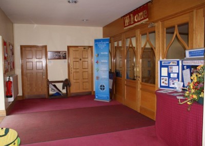 The main entrance into the church nowadays is through the newly created glass-doors, (6) a key feature in the church reordering scheme. You will find it a good place to view the church as a whole as you can see right through the lounge, nave and chancel, right through to the East Window. It’s a special place for brides to take a moment to stand and take a deep breath as they prepare to walk down the length of the church (7). The newly created foyer is welcoming and the redesign of this end of the church allowed the installation of modern toilet facilities (8). Moving anti-clockwise through the building we start in what is now the gents toilets where we find the first of many stained-glass windows (9). It depicts Jesus blessing the children and the text reads ‘Suffer little children and forbid them not to come unto me’. (KJV Matthew 19:14) .
